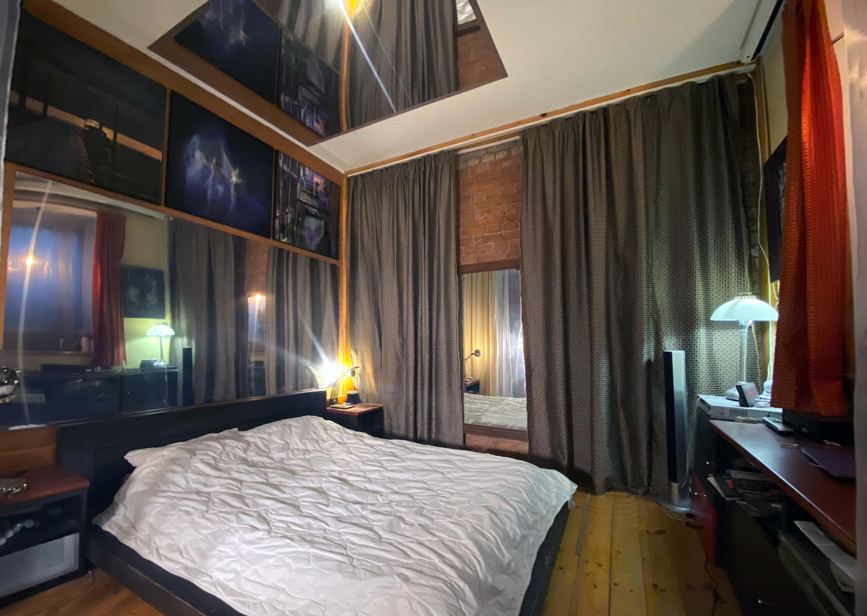 - по трем потолочным балкам в ширину студии полупрозрачные и плотные тканевые шторы, позволяющие творчески трансформировать пространство (см. фотографии)